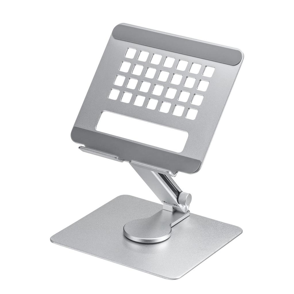 Dieser Tablet-Desktop-Ständer aus Aluminium verfügt über eine einstellbare Höhe mit einem ausziehbaren Arm.