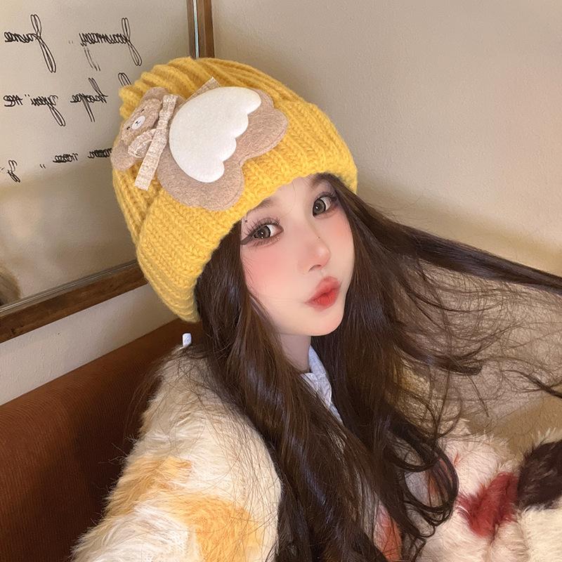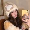 New Autumn and Winter Hat for Women's Bear Patch Wool Hat Korean Version of Versatile Warm Ear Protection Cute Knitted Hat Trendy