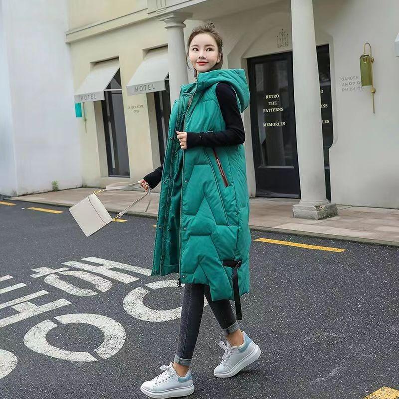 Down cotton long knee vest women's autumn and winter new fashion hooded casual vest jacket