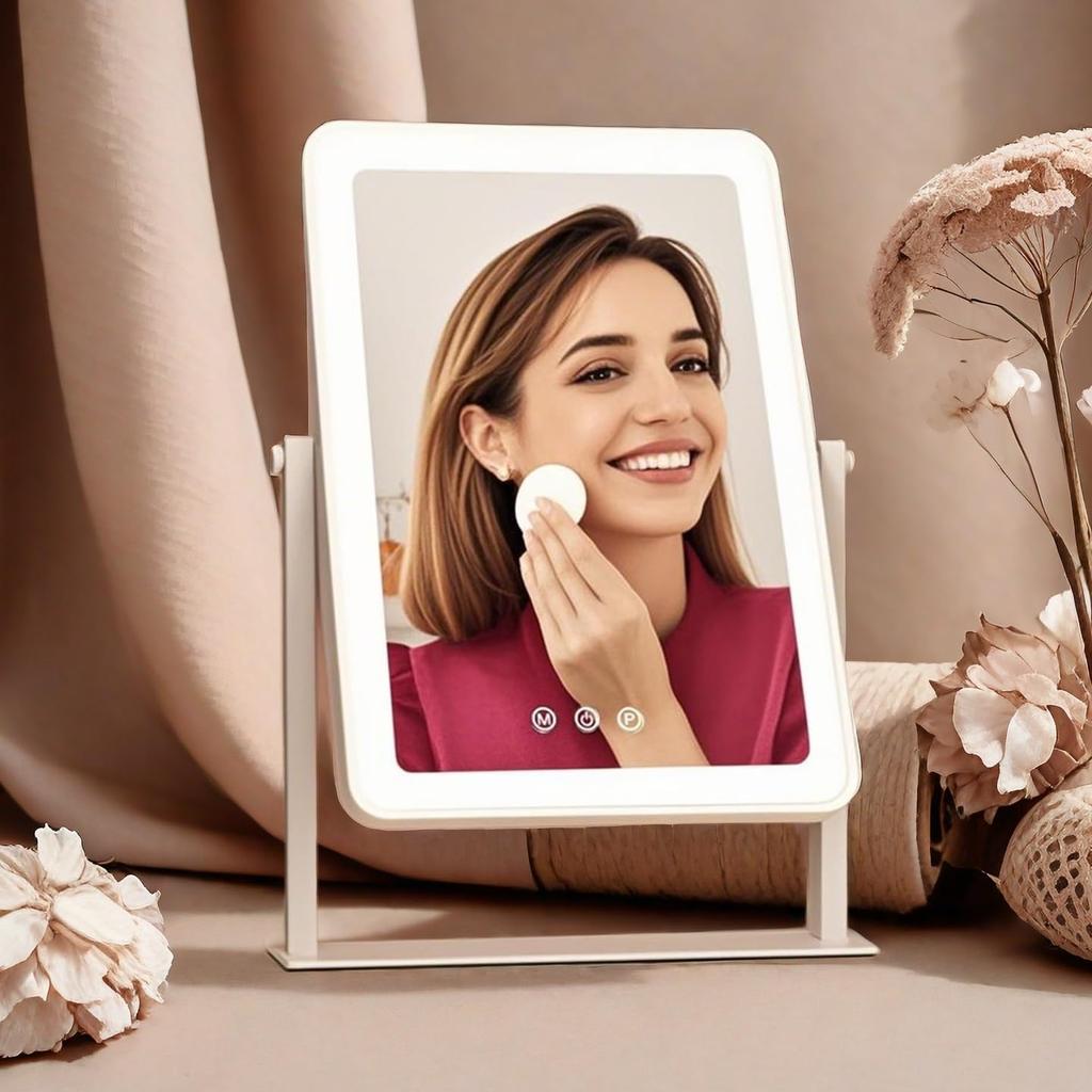 [3-Farben-Beleuchtungsmodi & Stufenloses Dimmen] Dieser beleuchtete Tischspiegel verfügt über drei LED-Farben: Tageslicht, Kaltweiß und Warmweiß. Drücken Sie einfach die Taste (M) Berühren Sie die Taste, um zwischen den drei Beleuchtungsmodi zu wechseln.. Die hochwertige, neutrale LED-Lichtquelle bietet eine helle, klare Sicht! Das LED-Licht des Schminkspiegels ist hell und schonend für die Augen, es leuchtet Ihr Gesicht gleichmäßig aus, ohne Schatten auf unebene Bereiche wie Augen und Mund zu werfen, und verhindert so ungleichmäßiges Make-up.. Der Schminkspiegel verfügt auch über eine stufenlose Dimmfunktion, die es Ihnen ermöglicht, die Helligkeit durch Drücken und Halten des berührungsempfindlichen Dimmfelds „P“ frei einzustellen. Dies macht ihn ideal, um das Licht für verschiedene Make-up- und Hautpflegeroutinen zu verändern.. Wählen Sie aus drei Farben: Tageslicht, Kaltweiß und Warmweiß. Wechseln Sie einfach zwischen den Modi mit der Touch-Taste und passen Sie die Helligkeit stufenlos nach Ihren Wünschen an.