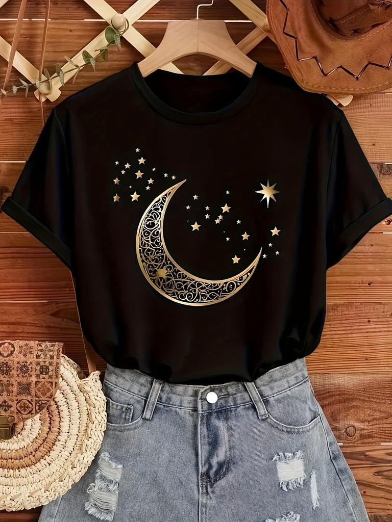 Elegantes Damen T-Shirt mit Mond- und Sternenprint, lässiges Kurzarm-Oberteil mit Rundhalsausschnitt für Frühling und Sommer, Oberteil mit goldenem Print, bequeme Passform
