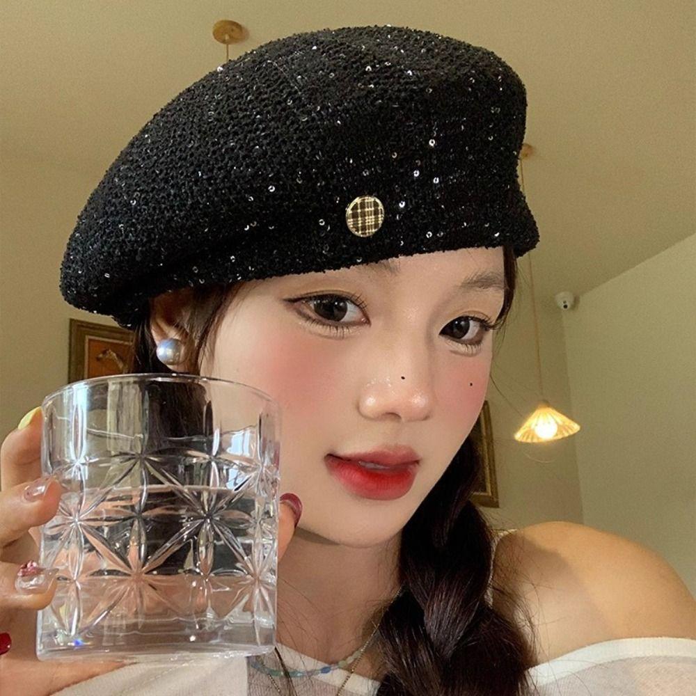 Breathable Sequin Beret Hat Paillette Crochet Knitted Cap Elegant Weave Hat Spring