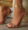 2025 Neue Damenabsätze Sexy Gold Vorhängeschloss High Heels Sandalen Dünner Einzelriemen Metall Stiletto Sandalen Gold Absatzschuhe