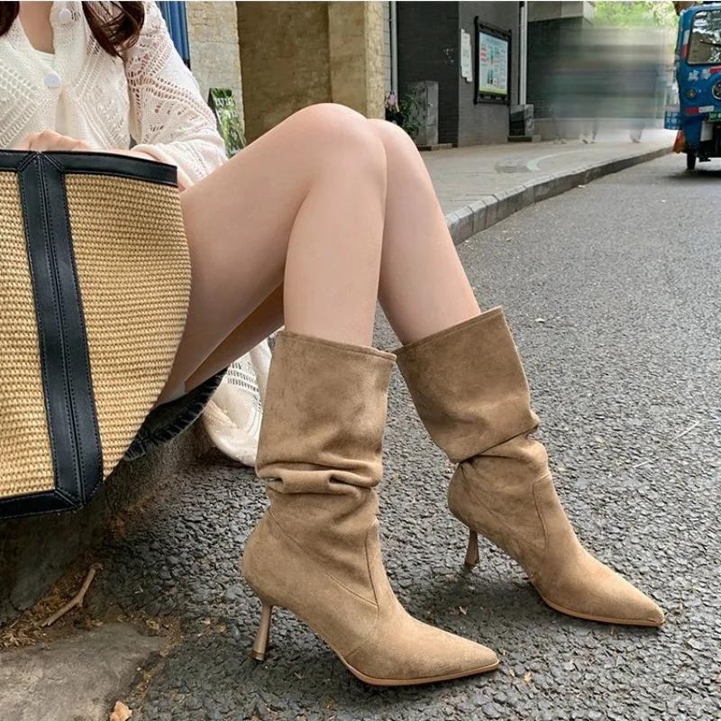 Wildleder-Mittelwadenstiefel mit dünnen Absätzen und hohen Absätzen, Damen-Taschen im Angebot 2025, Mode, Slipper, Nähte, Neuheit, Damenstiefel