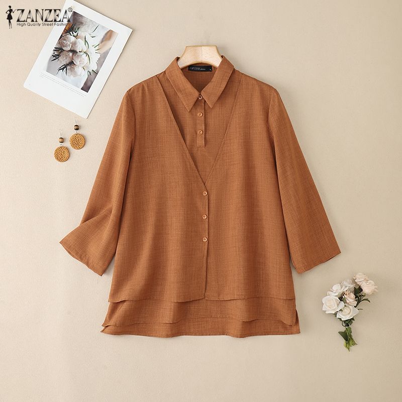 ZANZEA Women Casual Turn Down Collar 3/4 Sleeve Loose Blouse