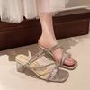 Strass-Pantoletten mit hohen Absätzen für Damen-Oberbekleidung 2025 Sommer neue Mode Schleife Kristall dicker Absatz mit Rock coole Pantoletten