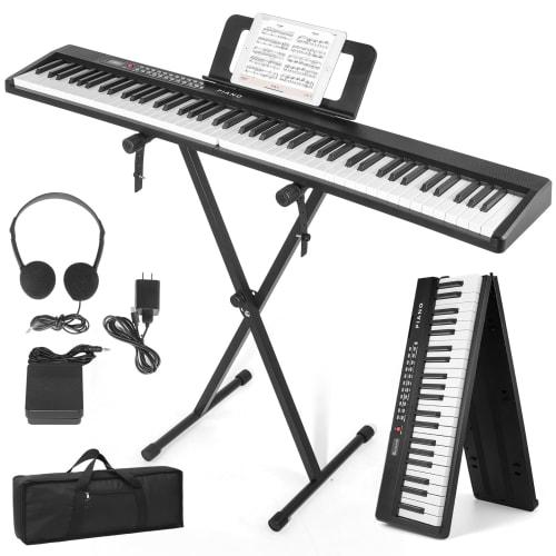 - Foldable electronic piano with stand Qerewf electronic piano is easy to move and store, and the built-in large capacity rechargeable battery can be used for long periods of time.A special case is also included.What's more, you can fold it up by simply pressing the button on the back, so you don't have to worry about losing the lock.The compact and lightweight design allows you to take it anywhere, making it especially suitable for travel and on-the-go use.
