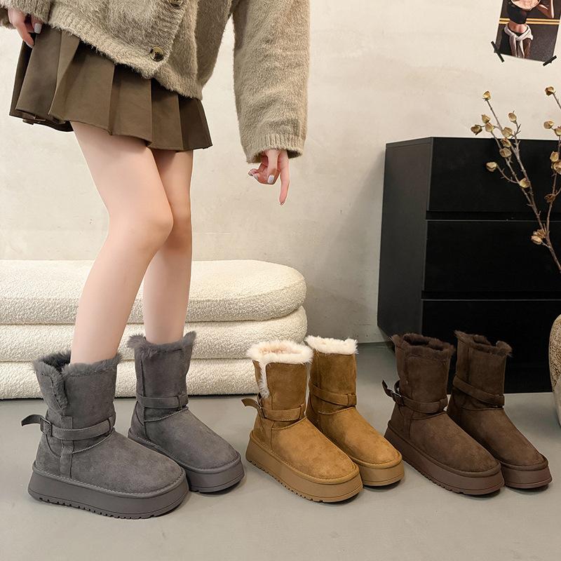 Dicksöhlige Samt-Plateau-Schneestiefel für Damen Herbst und Winter 2025, neue verdickte mittelhohe Stiefel, zwei Tragemöglichkeiten, Gürtelschnalle, warme Baumwollschuhe, Trend