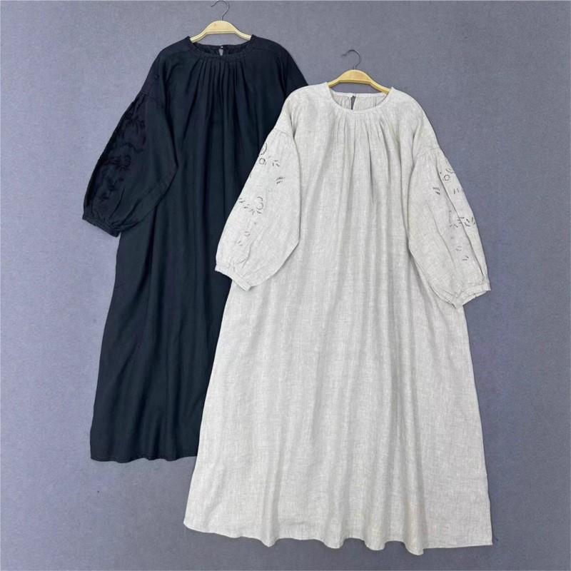 Johnature Round Neck Hollow Embroidery Long Sleeve Dress Women Autumn Winter Vintage Round Neck Pleated Robe Dress
