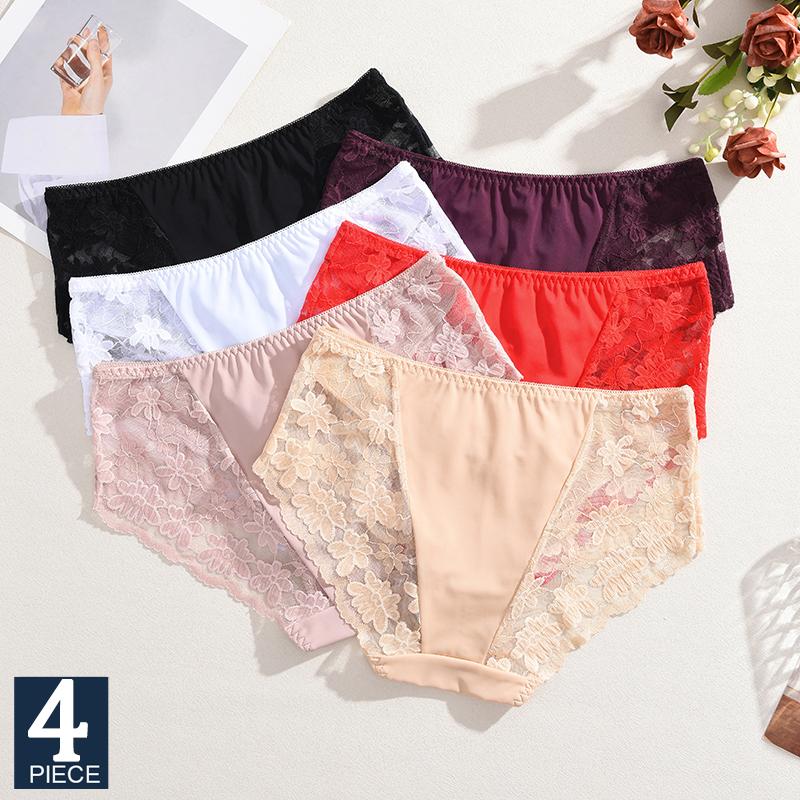 4PCS/Set Women Splice Panties Lace Floral Embroidery Briefs Sexy Female Underwear Lingerie for Ladies Transparent Briefs