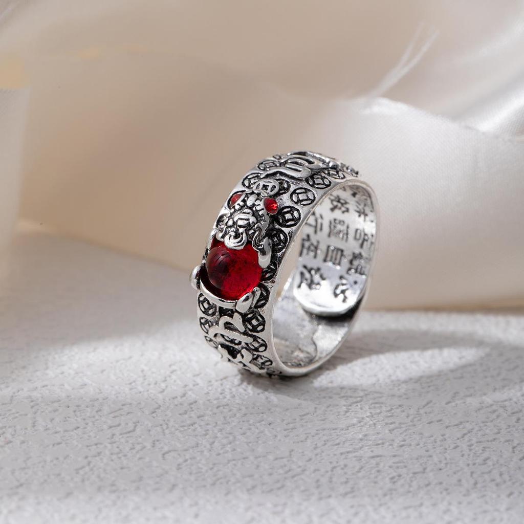 Glückskröte Damen Verstellbarer Granat Pixiu Ring mit Sechs-Silben-Mantra für Reichtum und Schutz.