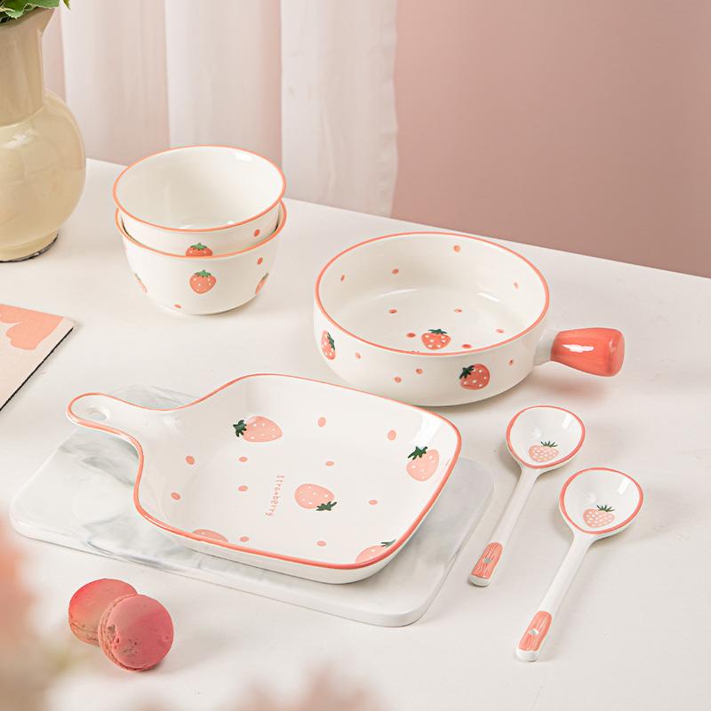 Strawberry Ceramic Bowl & Plate Set: Cute, Girly Dinnerware for Kids' Meals
