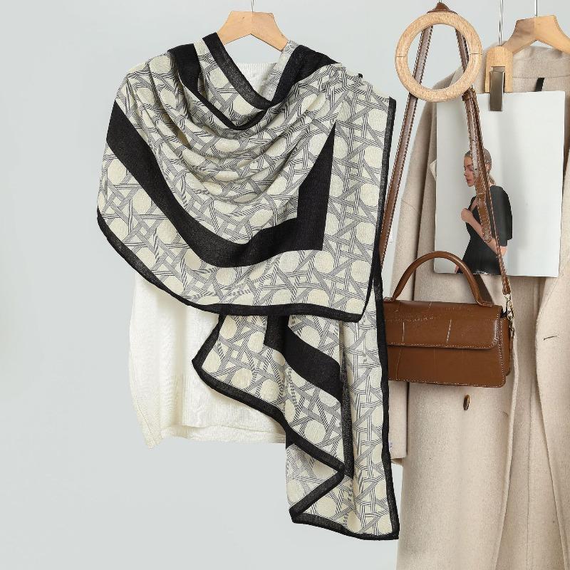 Women's simple rattan grid printing silk scarf, simple and versatile photo scarf, autumn and winter cold-proof and warm scarf