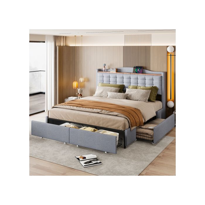 Lit double rembourré - MUVOE - 160x200 cm - Tiroirs de rangement - Prise USB intégrée - Tissu lin gris