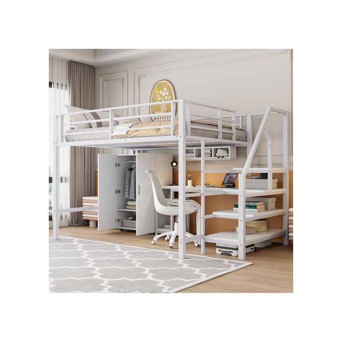 Hochbett - MUVOE - 140x200cm - Weiß - Integrierter Schreibtisch - Schrank und Regale inklusive