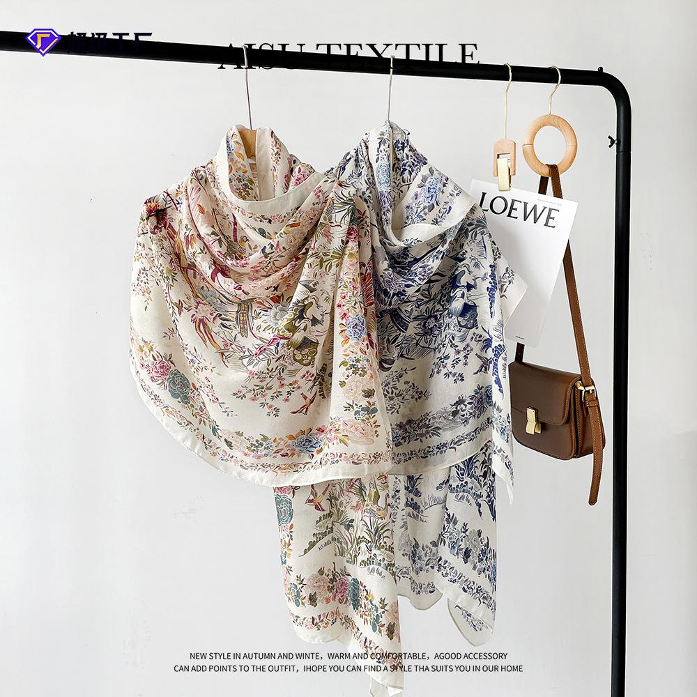 New cotton and linen scarf women's autumn high-end flower and bird printing silk scarf soft and thin shawl headscarf