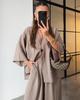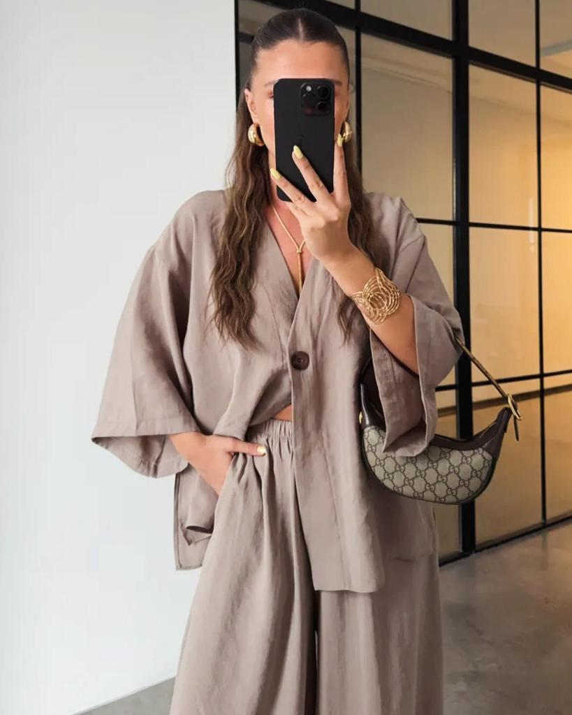 Damenmode Lässiges Zweiteiler-Set: V-Ausschnitt Ein-Knopf Langarm-Oberteil mit High-Waist-Hose