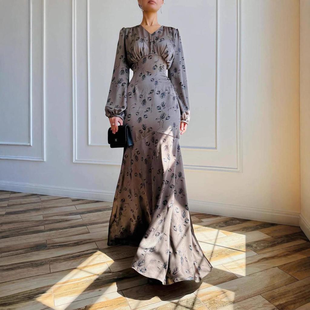 2025 Autumn V-Neck Floral Satin Evening Dress - High-Waisted & Slimming Design for European and American Women