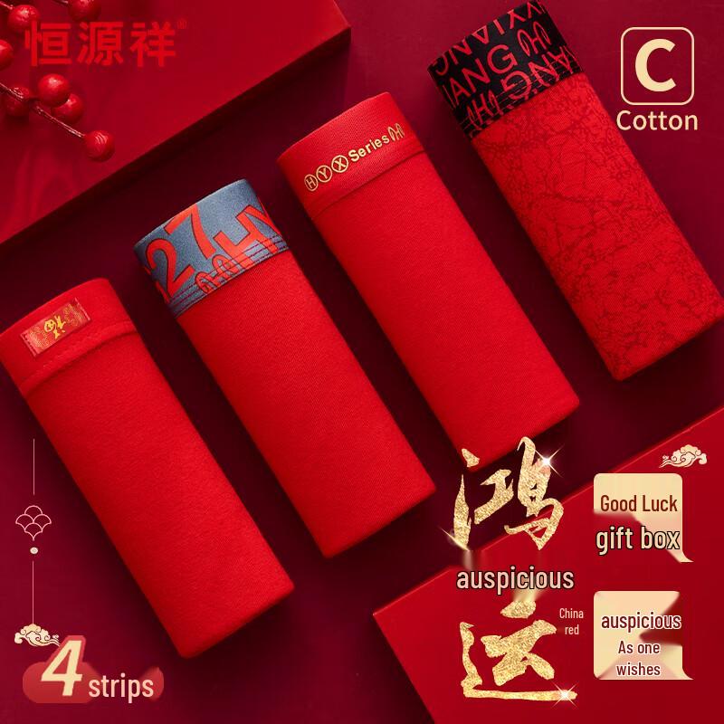 Hengyuanxiang Men's Lucky Red Cotton Boxer Briefs 4-Pack