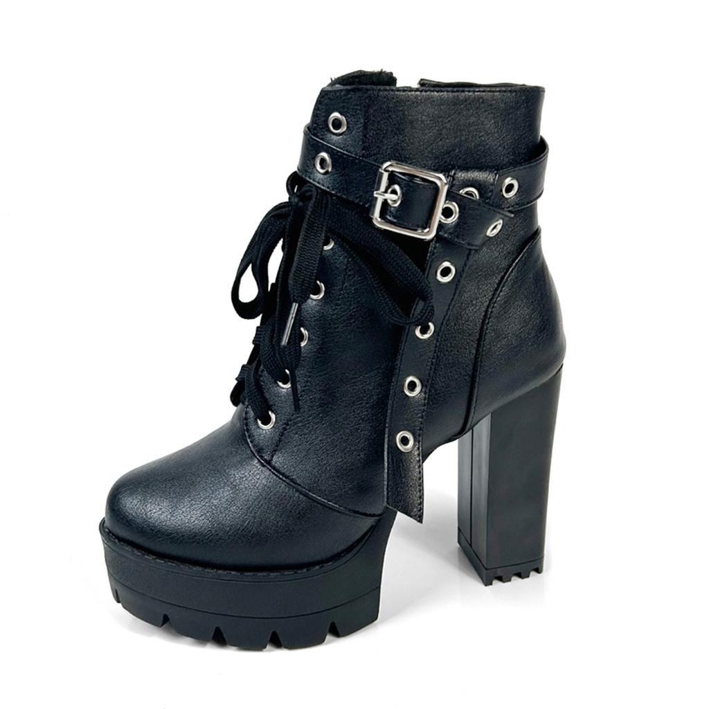 FOREADA Damen Stiefeletten Runde Zehenpartie Dicke Hohe Absätze Plateau Reißverschluss Schnürung Kurze Stiefel Damen Modeschuhe Herbst Winter Schwarz