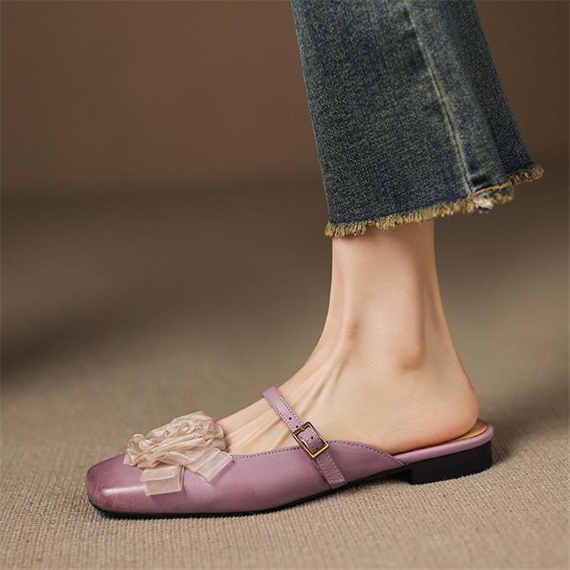 Mode Neue Sommer Hausschuhe Echtes Leder Hausschuhe für Damen Mode Blume Quadratische Zehenschuhe Niedrige Absätze Zehenbedeckende Hausschuhe Sandalen