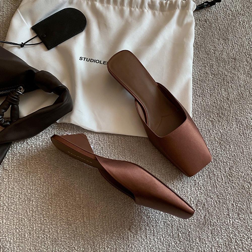 Trendige französische Satin-Muller-Schuhe mit dreieckigem Absatz, neue Katzenabsatz-Tasche, halber Drag-Stil, coole Damen-Slipper