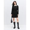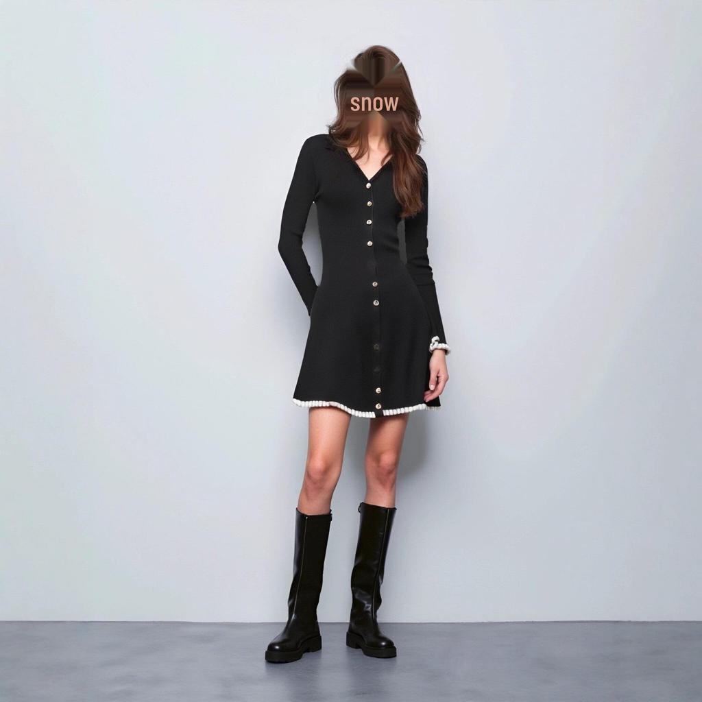 2025 Frühherbst Europäisches & Amerikanisches Damen Schwarzes Gestricktes Revers Einreihiges Kurzes Slim-Kleid.