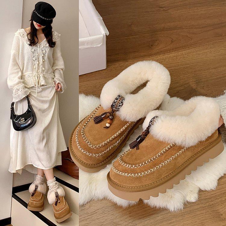 [Rindslederversion] Neue Version~ Handgenähte Dicksohlige Baotou Woll-Loafer Hausschuhe Damen Schneestiefel