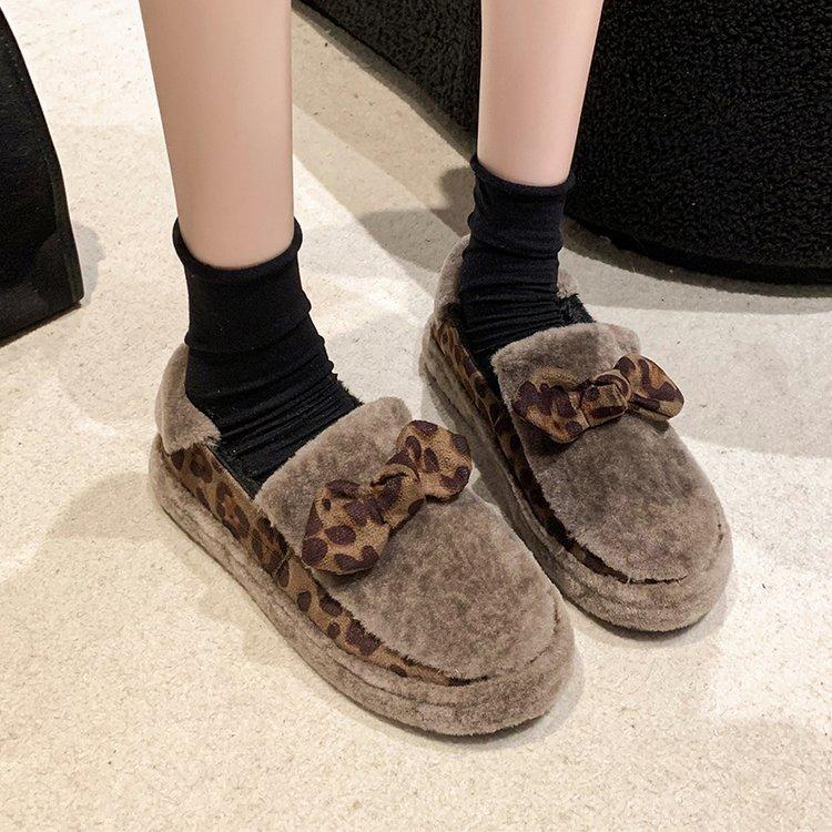 [Yushilai] Modische Loafer mit Leopardenmuster und Schleife für Damen 2025 Winter neue dicksohlige Samt-Thermo-Baumwollschuhe