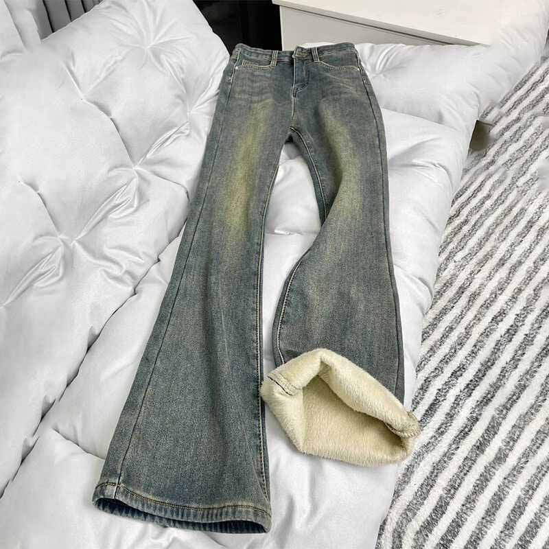 Fleece Lined Straight Leg Jeans Women Autumn Winter Plus Size High Waist Hip Wide Stretch Bootcut Horsehoof Pants