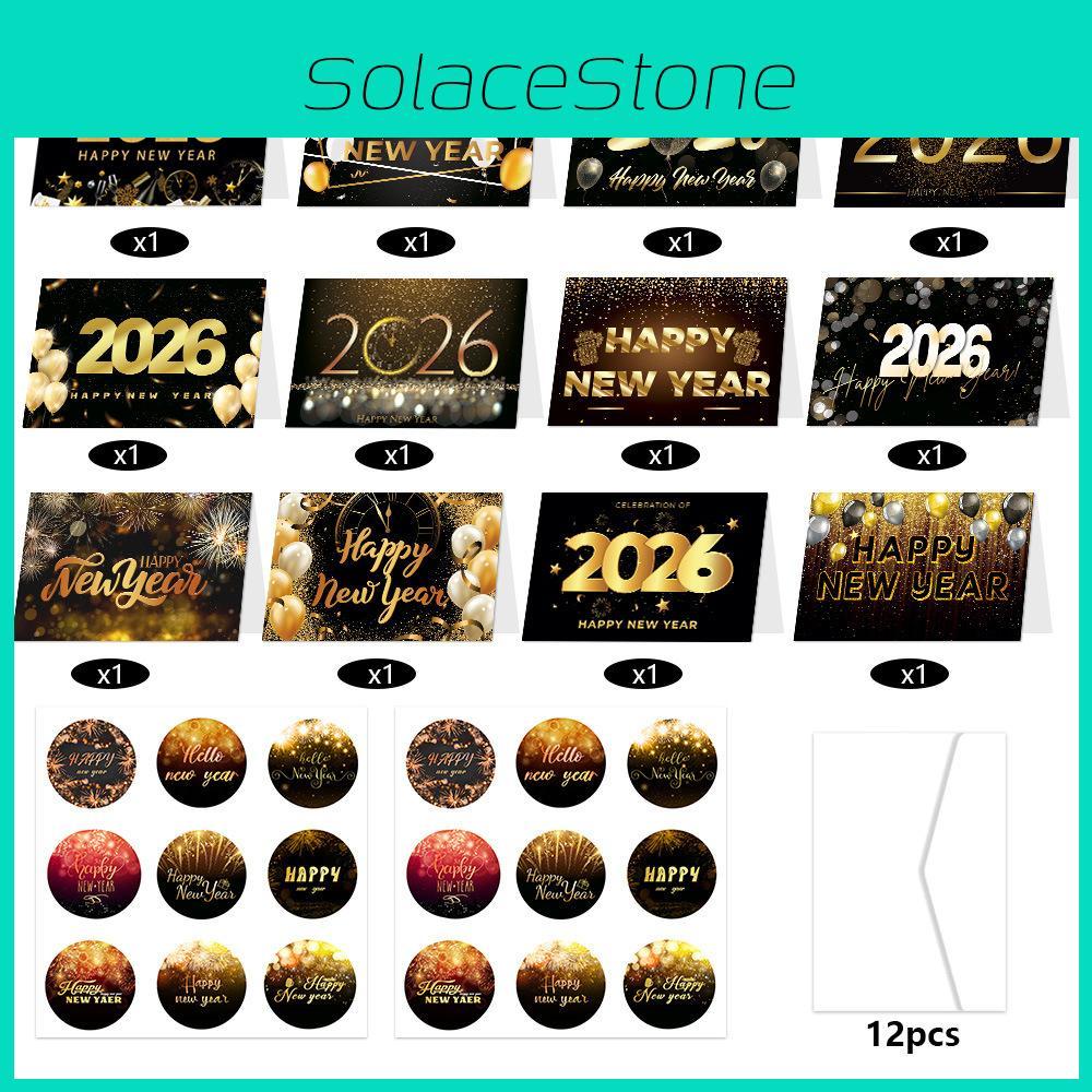 This New Year-themed black and gold color card set features 12 greeting cards, crafted from durable paper providing a festive touch for celebrations. Ideal for decorating parties or sending holiday wishes, these items enhance seasonal decor. Wipe clean with a damp cloth to maintain the vibrant finish.
