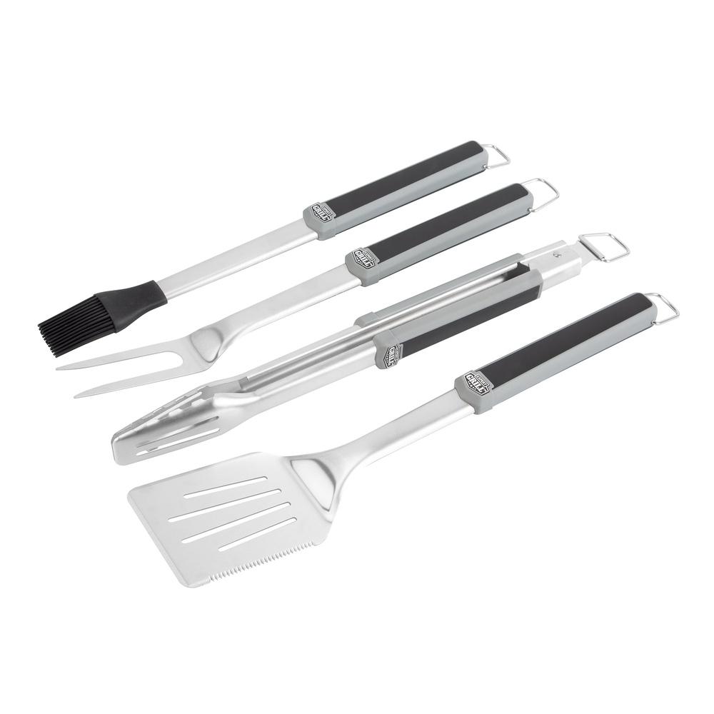Stainless Steel Grilling Tools Set 4 Piece BBQ Set with Tongs Spatula Fork Basting Brush Ergonomic Handles Hooks Dishwasher Safe