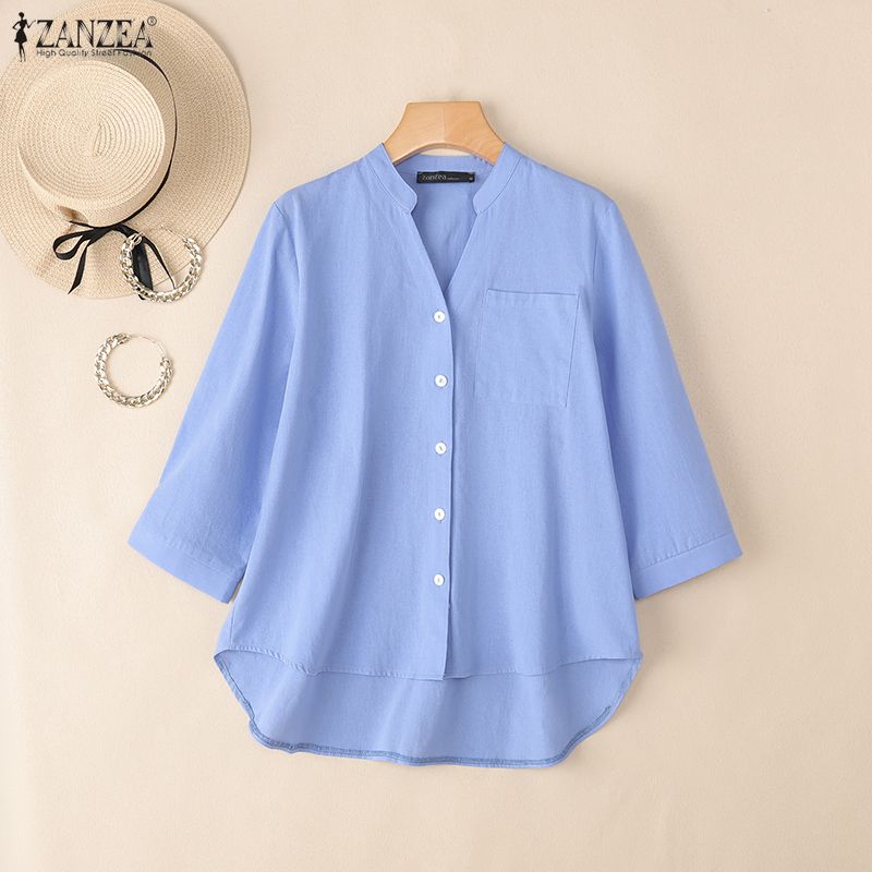 ZANZEA Women Casual V-Neck Solid Color Loose 3/4 Sleeve Cotton Blouse