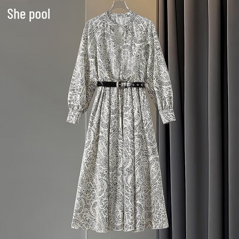 Tachi Damen V-Ausschnitt Kontrastdruck Langarm Midi-Kleid
