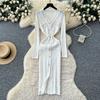 Neue Damenkleider Herbst Winter Vintage Patchwork Strick-Midikleid Elegant V-Ausschnitt Damen Rüschenhemd Pulloverkleid