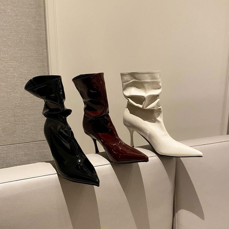 Temperament Lackleder High-Heel Stiefeletten Damen 2025 Herbst und Winter Neu Spitz Mode Vielseitig Mittelhohe Stiefel Schwarz Stacking Stiefel