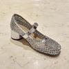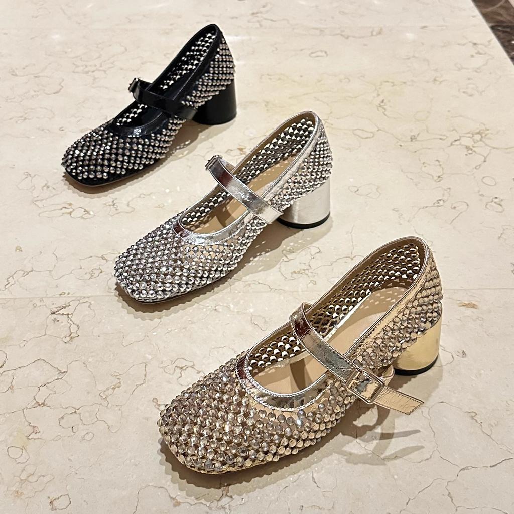 Europäische Station Damenschuhe 2025 Sommer neu Strass hohl atmungsaktives Mesh dicker Absatz Wort mit Mary Jane niedrig Absatz Sandalen