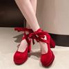 2024 Wildleder Schleifenschuhe Damen Süßes Rosa Mary Jane Schuhe Kreuzriemen Dicke Absätze Schuhe Damen Elegant Kleid Party Pumps