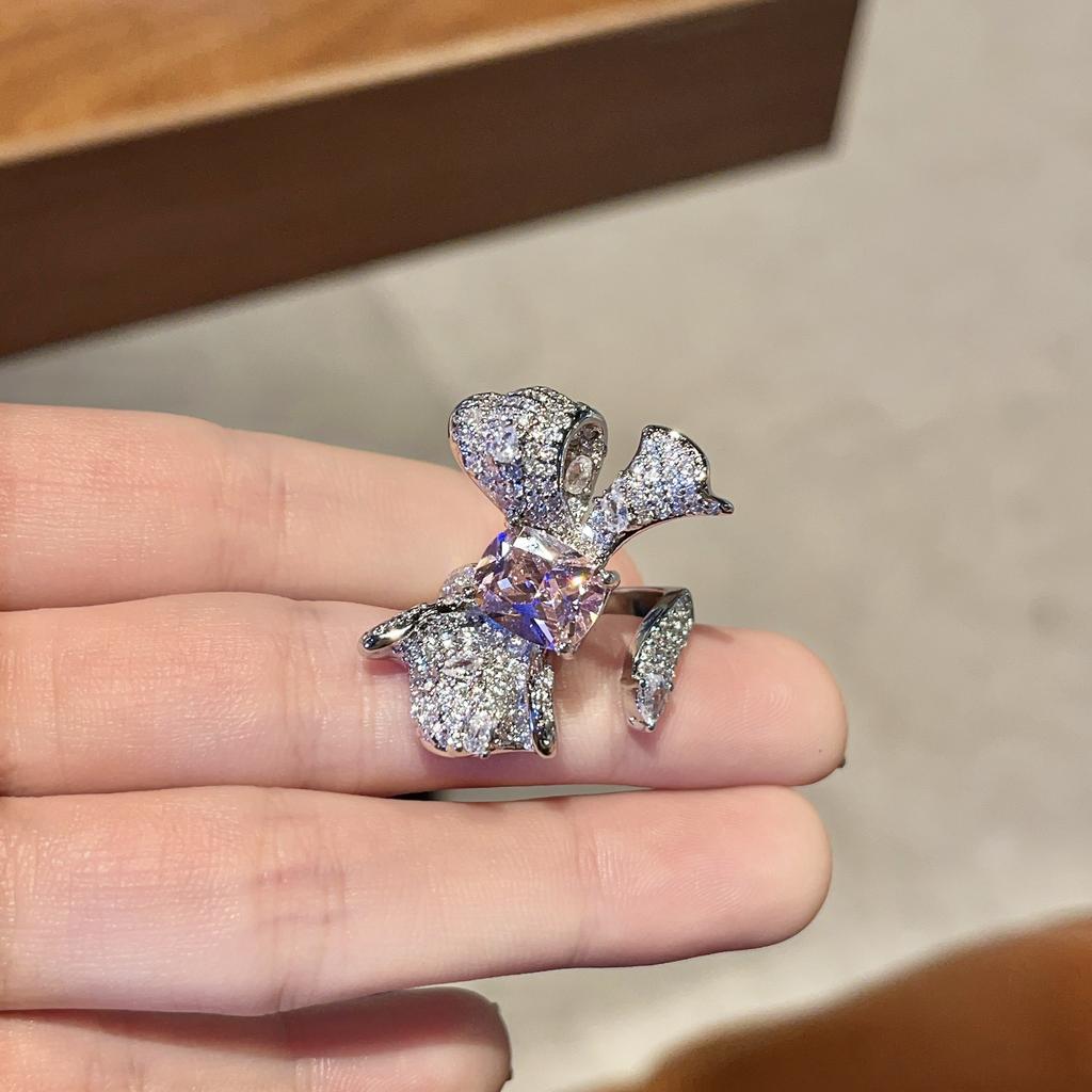 Bright Pink Diamond Colored Treasure Flower Ring Women'S Opening Light Luxury High Sense Design Elegant Temperament