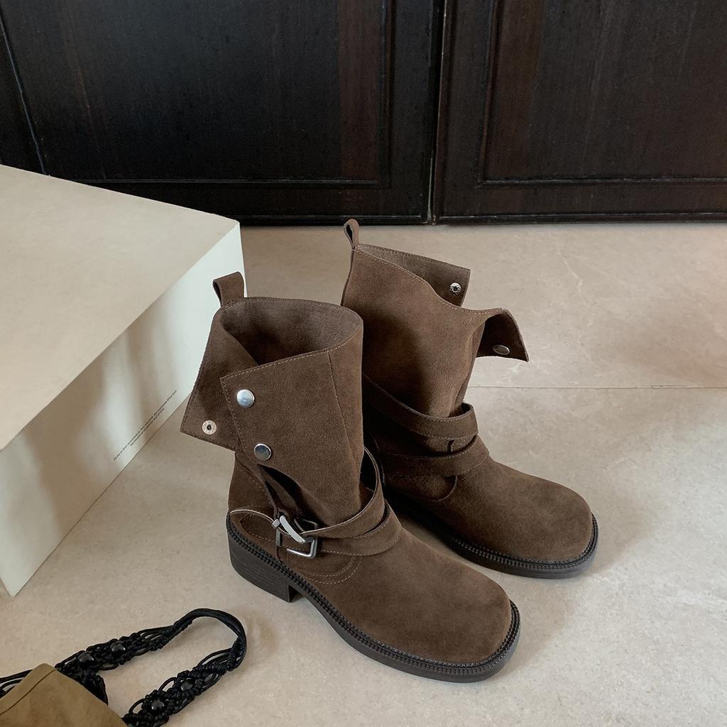 Schafleder~ Höhenzunahme 6cm Maillard Retro Dicke Ferse Kurze Stiefel Damen Kuhveloursleder Kurze Reiterstiefel Dicksohlige Martin Stiefel