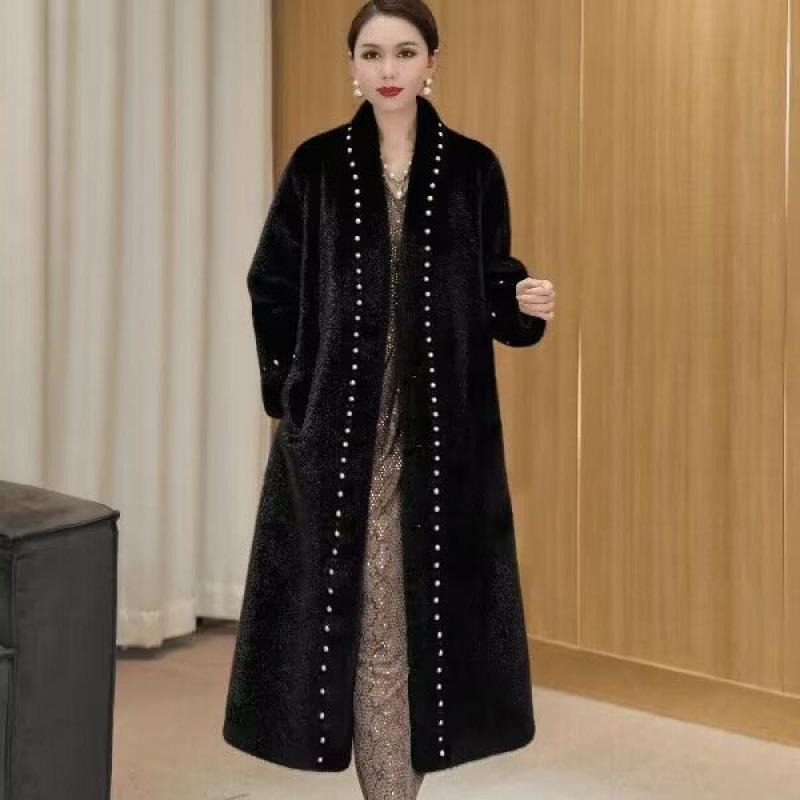 Winter new fashion light luxury pearl fur integrated long coat women's coat loose warm thickened