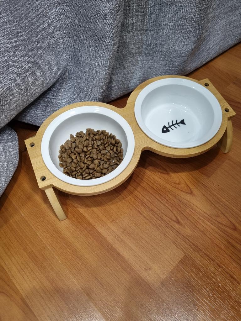 Raised Wooden Ceramic Pet Bowl, Double Elevated Cat Feeder with Removable Bowls, Anti-Spill, Neck Protection