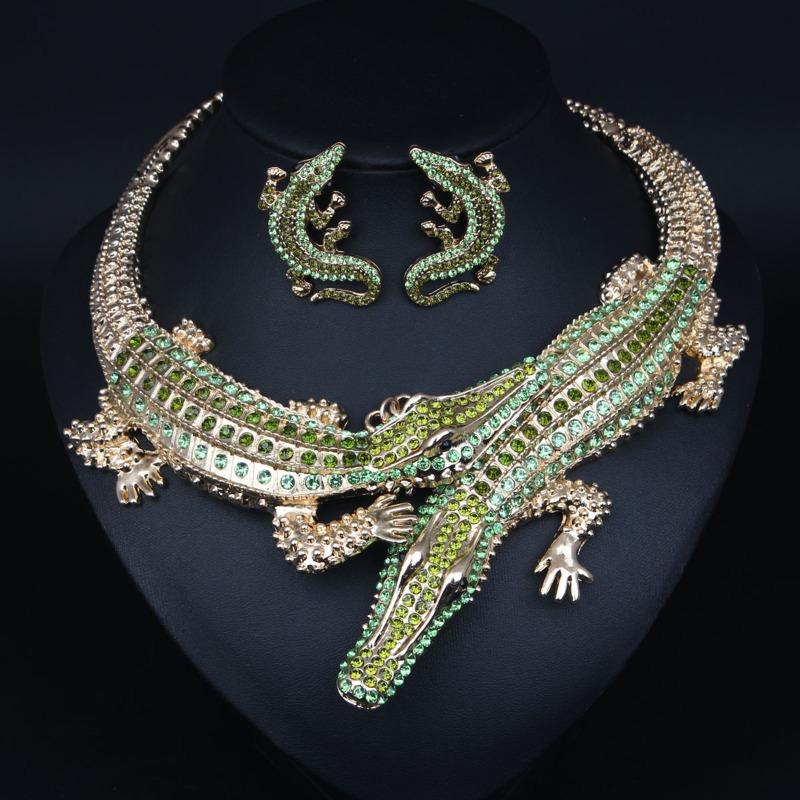 Vintage Übertriebene Krokodil Halskette Ohrringe Set mit Diamant Personalisierter Kragen Damen Accessoires
