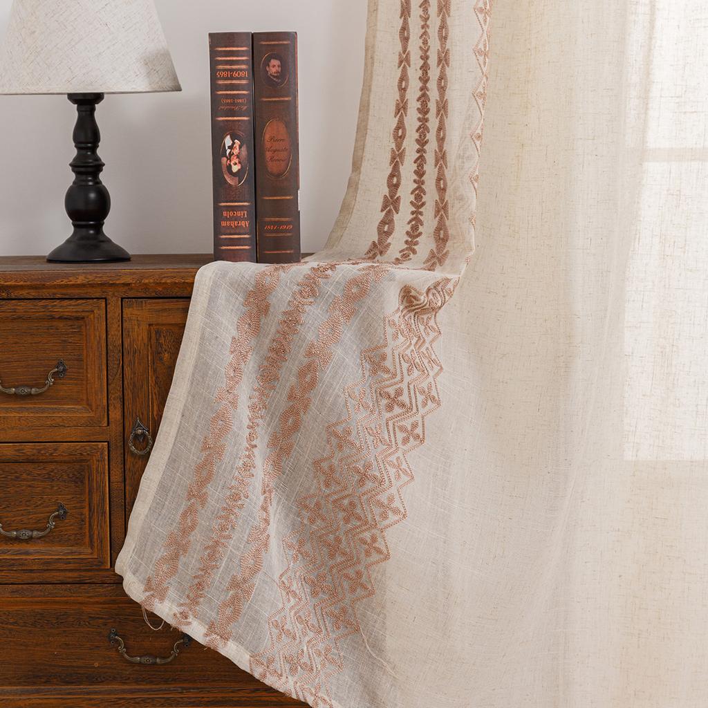 63 Zoll Lange Bauernhausvorhänge für Wohnzimmer Vintage Floral Gestreifte Strukturierte Leinenvorhänge Boho Bestickte Cottage-Vorhänge