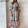 BITCED Women's Spring Elegant Commuter Print Lantern Sleeve Waist-cinched Full-skirted Dress