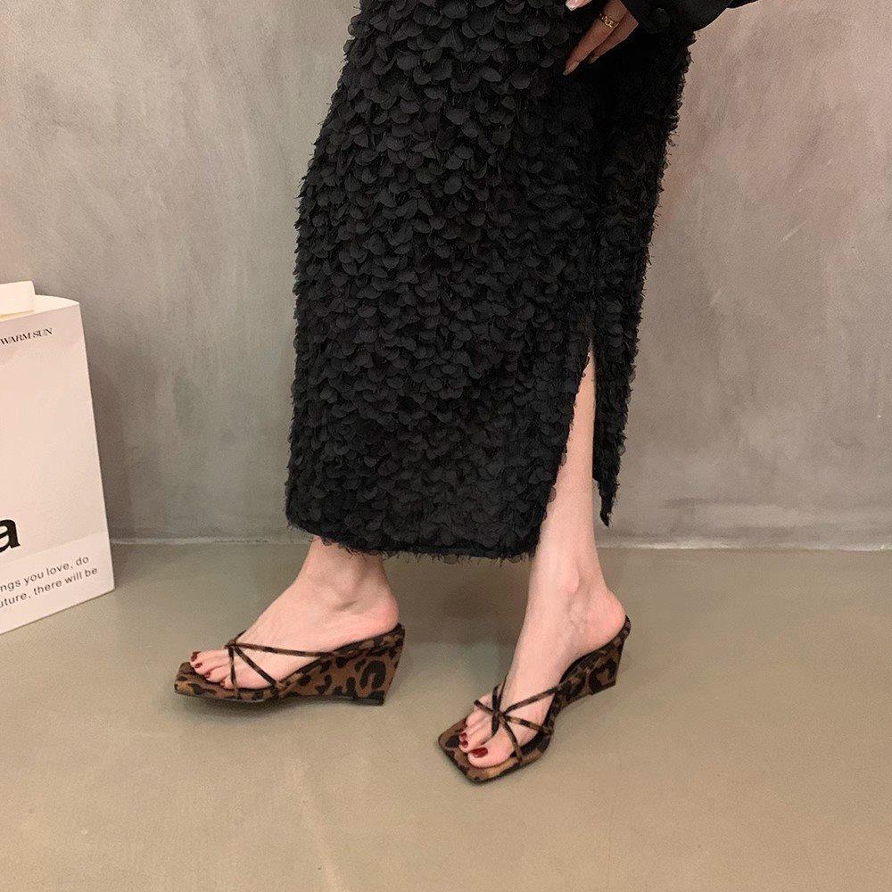 Leopardenmuster neu mit modischer französischer Oberbekleidung 2025 Rock schöne High Heels coole Slipper Keilabsatz Sommer Nischensandalen