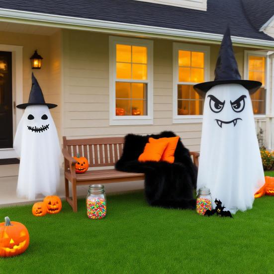 Halloween Geisterdekorationen DIY Ausdrücke Gruseliges Weißes Geister Bastelset mit Hexenhut für Außen Innen Hof Garten Rasen Dekor