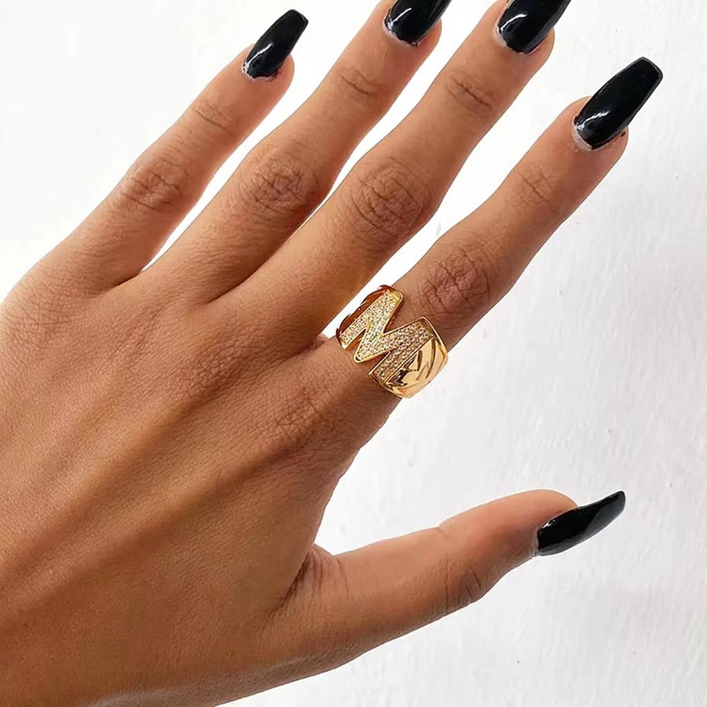 Mikro-Pavé Zirkonia Ring, Ring mit einem Buchstaben, Damenring, offen, verstellbar, k-vergoldeter hellgoldfarbener Ring.