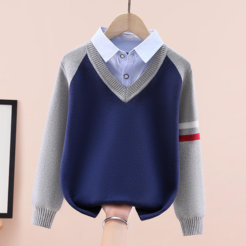 Jungen Strickpullover mit Fleecefutter: Dickes Fake-Zweiteiler-Design für Frühling/Herbst/Winter