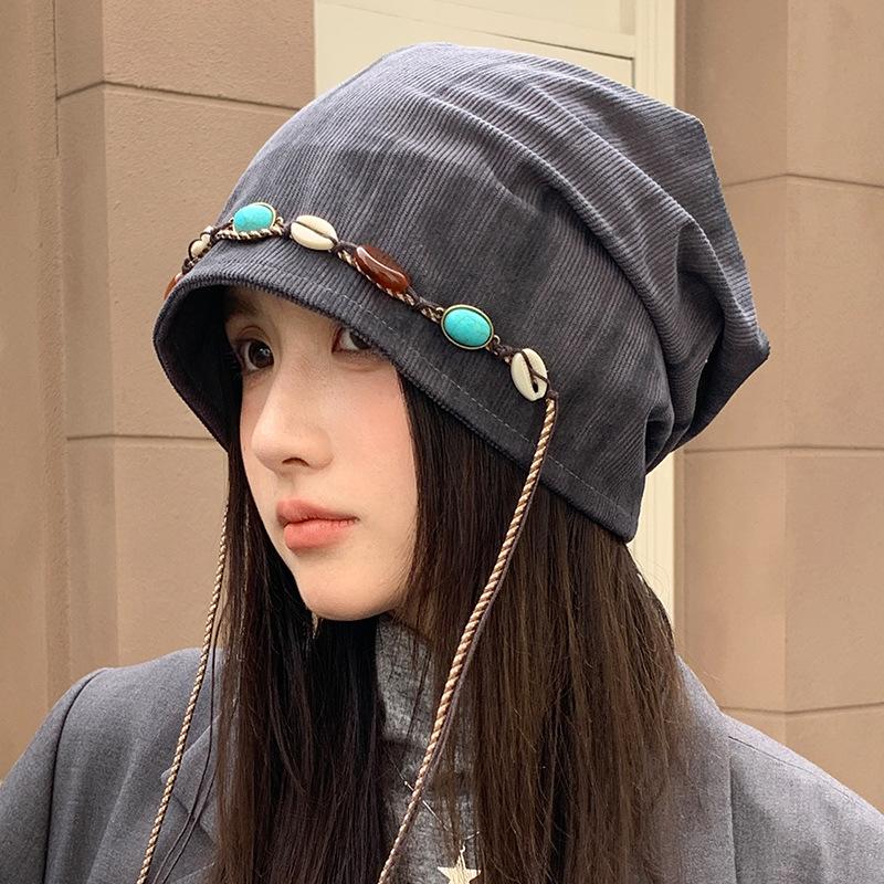 Women'S Autumn/Winter Loose Fit Turban Hat Ethnic Tie-Dye Headwrap Beanie With Beaded Tassel Decor